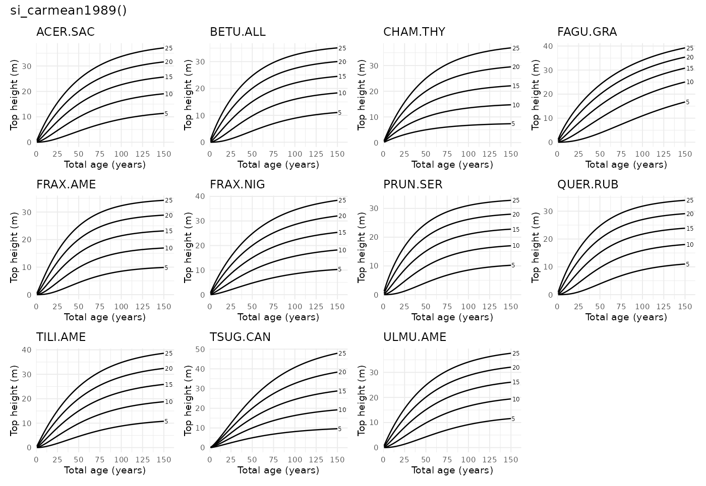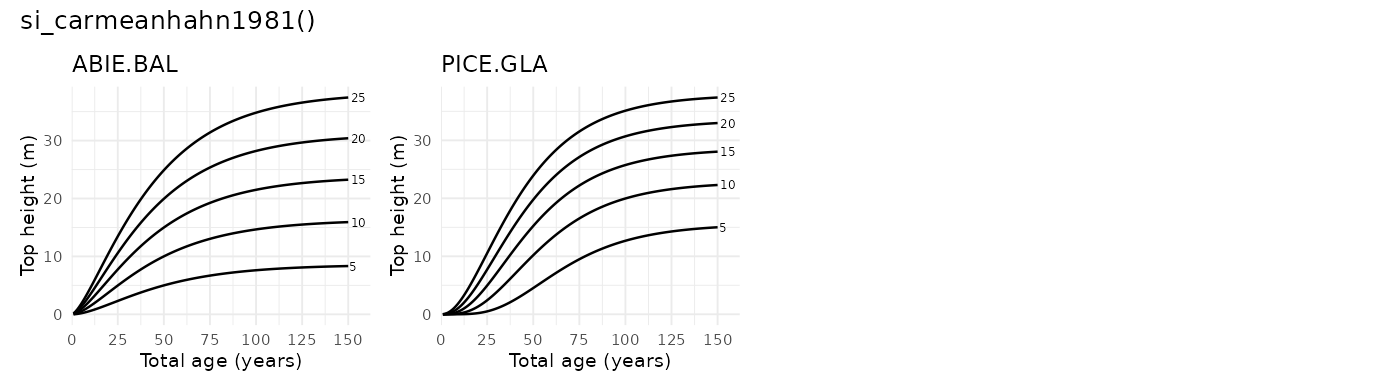 si_carmean1989() - Description: Carmean et al. (1989) eastern species site-index model set Carmean et al. (1989)